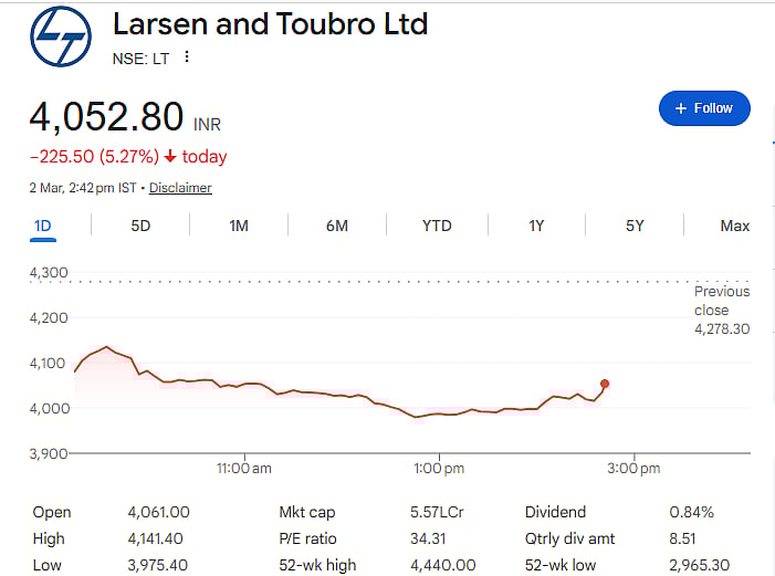 Mumbai: Shares of Larsen & Toubro (L&T) saw a sharp fall on Monday, marking the biggest drop of the year. The stock slipped from its previous close of Rs 4,278.30 to Rs 4,061 and fell nearly 7 percent during the day to touch Rs 3,975.40.