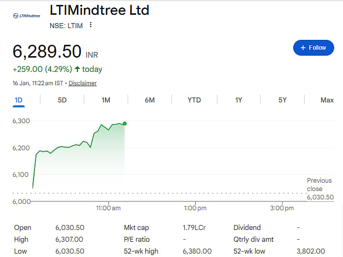 LTIMindtree shares surged 4.29 percent on January 16, trading at Rs 6,289.50 by 11:22 AM, up Rs 259 from the previous close. The stock opened at Rs 6,030.50 and touched an intraday high of Rs 6,307. This sharp rise followed the company’s announcement of a Rs 3,000 crore, 7-year deal with the Central Board of Direct Taxes to build an AI-driven tax analytics platform. Investors responded positively to the strategic government contract, pushing the stock closer to its 52-week high of Rs 6,380.