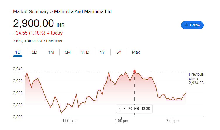The shares of mahindra and mahindra were trading around Rs 2,900 per share on the NSE (National Stock Exchange), with a decline of 1.18 per cent amounting to a Rs 34.55 per share on the Indian bourses.