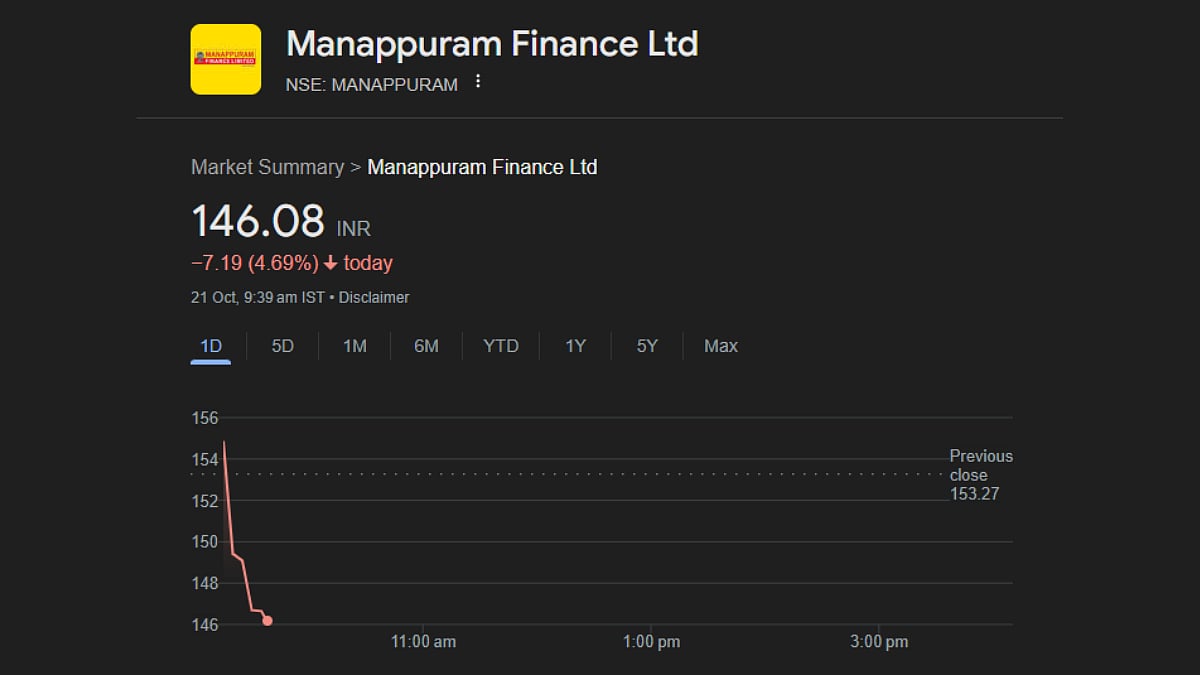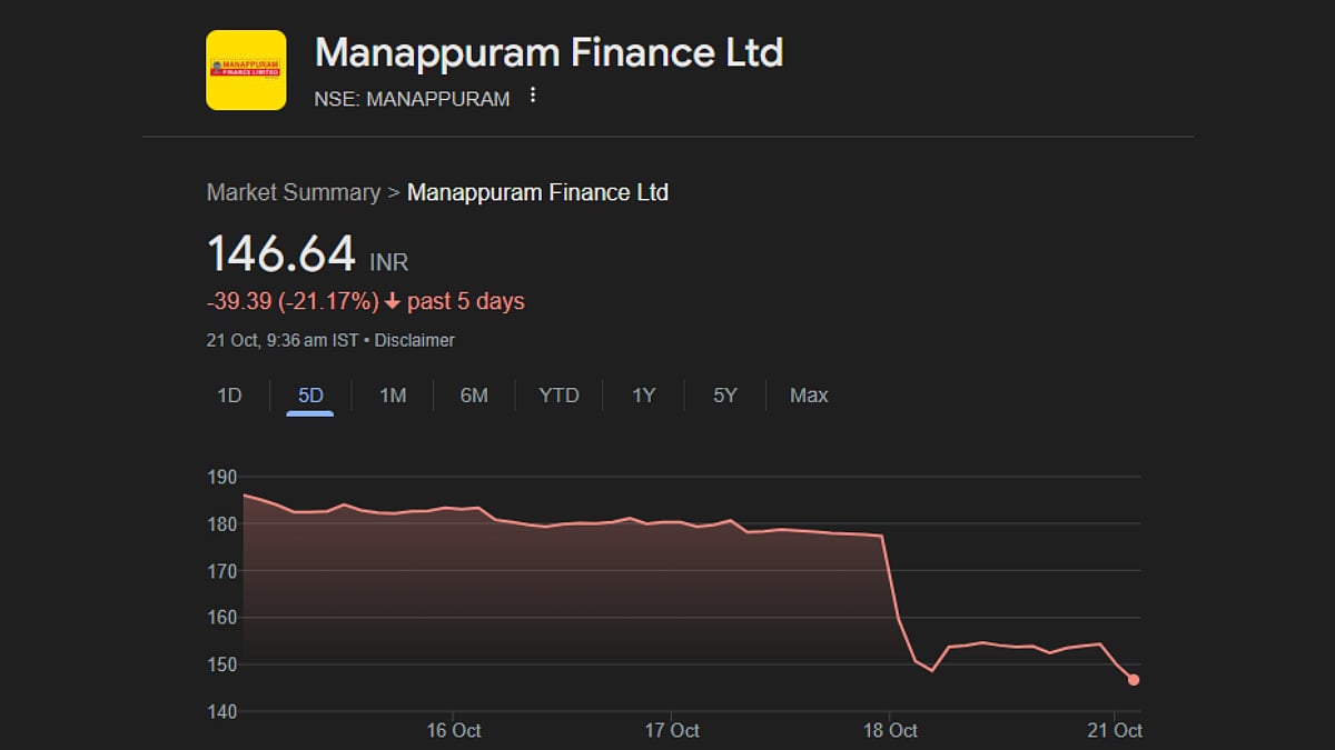 The shares of one of the most renowned Non-Banking Financial Corporations, or NBFCs, in India, Manapurram Finance, continue to remain in a soup as the new trading week begins on Monday. The company shares collapsed by a monumental 2.94 per cent at the very opening of the day's trade on October 21.