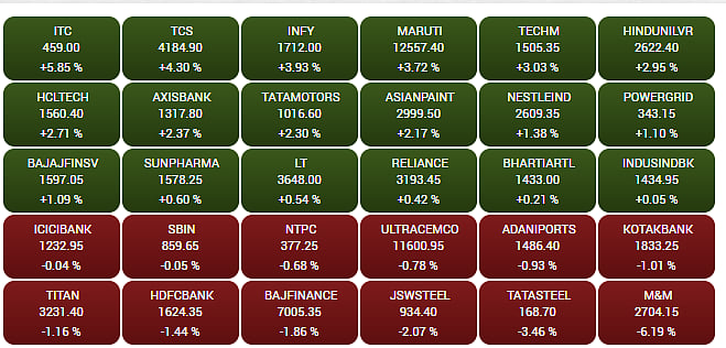 Among the Sensex pack, ITC lead the way, gaining 5.85%. It was followed by TCS (4.30%), Infosys (3.93%), Maruti (3.72%), and Tech Mahindra (3.03%).