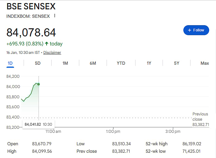 Mumbai: Indian equity markets started Friday’s session on a positive note, tracking firm global cues and strong buying in IT stocks. The BSE Sensex climbed 695 points to 84, 078 in early trade, while the NSE Nifty rose 192 points to 25,858.