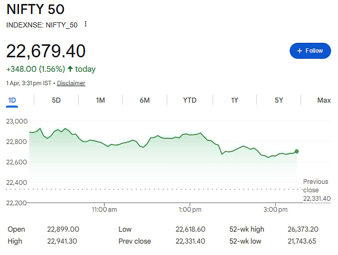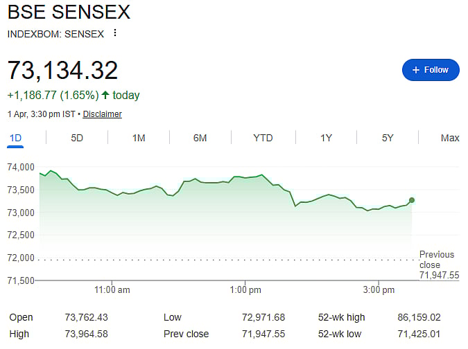 Mumbai: The stock market bounced back strongly after two days of losses. The Sensex rose 1,187 points to close at 73,134, while the Nifty gained 348 points to end at 22,679. However, both indices came off their day’s highs, showing some late selling.