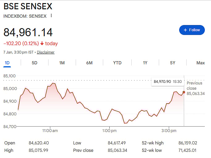 The BSE Sensex slipped 102.20 points, or 0.12 percent, to close at 84,961.14. During the session, the index fell as much as 446 points as selling intensified in the afternoon. The NSE Nifty also ended lower, declining 37.95 points, or 0.14 percent, to settle at 26,140.75.