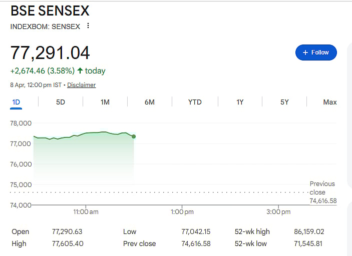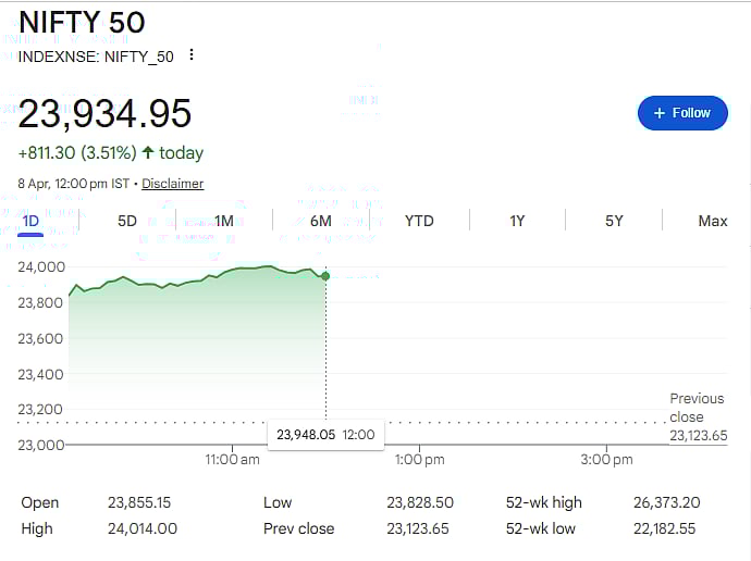 Mumbai: Indian stock markets opened with strong gains on Wednesday, supported by positive global cues and a sharp fall in crude oil prices. The Nifty rose to around 23,934, while the Sensex climbed to 77,291, gaining 3.5 percent and 3.58 percent respectively. During the day, the Nifty briefly crossed the 24,000 mark after 22 sessions.