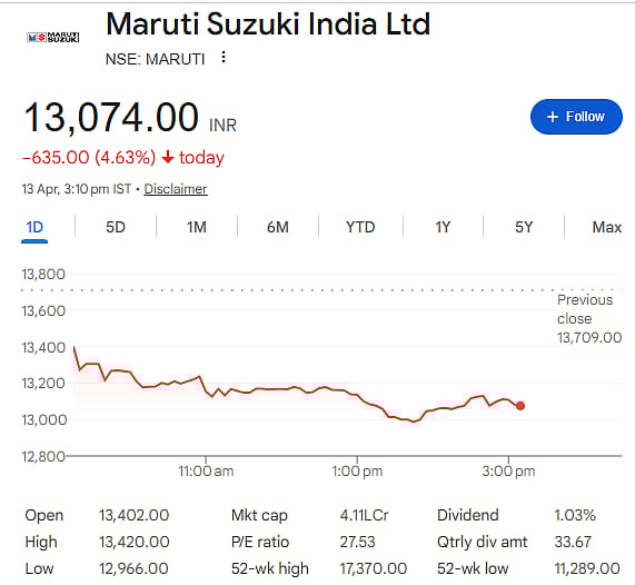 Mumbai: Shares of Maruti Suzuki India declined sharply on Monday, April 13. The stock fell over 4.6 percent to around Rs 13,074, making it one of the worst performers in the auto sector.