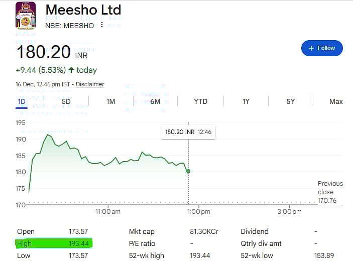 Mumbai: Shares of recently listed e-commerce company Meesho saw a strong rally in morning trade on Tuesday, December 16. The stock jumped over 13 percent to reach an all-time high of Rs 193.44 on the NSE. This comes just days after its successful market debut on December 10.