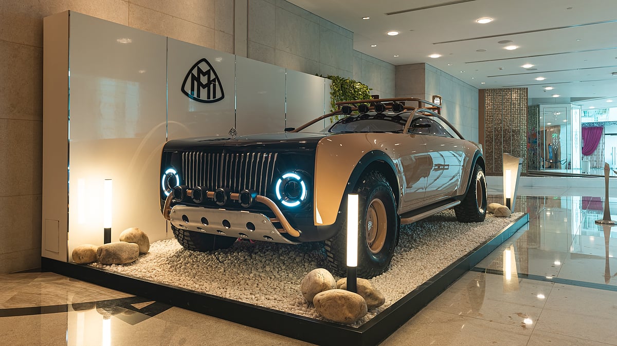 The Project Maybach concept car, showcased in a distinctive sandy monotone exterior and equipped with a roll bar, blends high-stakes adventure with luxury. Inside, the cabin is designed as a modular space resembling a high-end hotel room, featuring seats that convert into a first-class flatbed. The jacquard houndstooth-finish headrests can be used as blankets, and smartly designed compartments include reading lights. The seats are removable, suitcase style, and can be used in a premium tent.