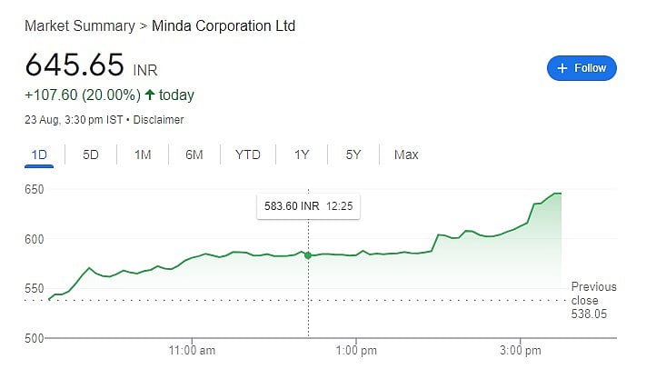 The stock opened at Rs. 538.70 per share on the National Stock Exchange. The Minda Corporation stock has touched a day-high price of Rs 645.50 per share on the stock exchange.