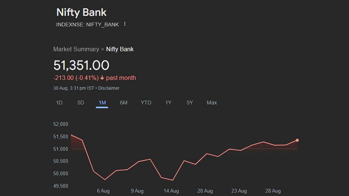 Unfortunately, the story was not exactly the same with another major index, this one carrying the all-important banking stocks. The Nifty Bank index, contrary to the other index, closed August in red. The index lost 0.41 per cent or 213.00 points, closing at 51,351.00.