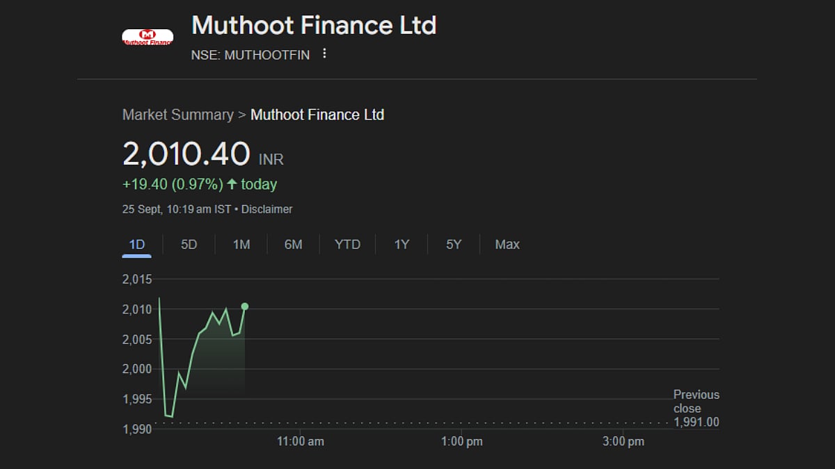 In the early hours of the day's trade on Wednesday, September 25, the share of one of the biggest private names in the industry, Muthoot Finance Ltd rose by 0.97 per cent or Rs 19.40. After a steady rise in the prospects, the company shares rose to Rs 2,010.40, crossing teh Rs 2,000 mark.