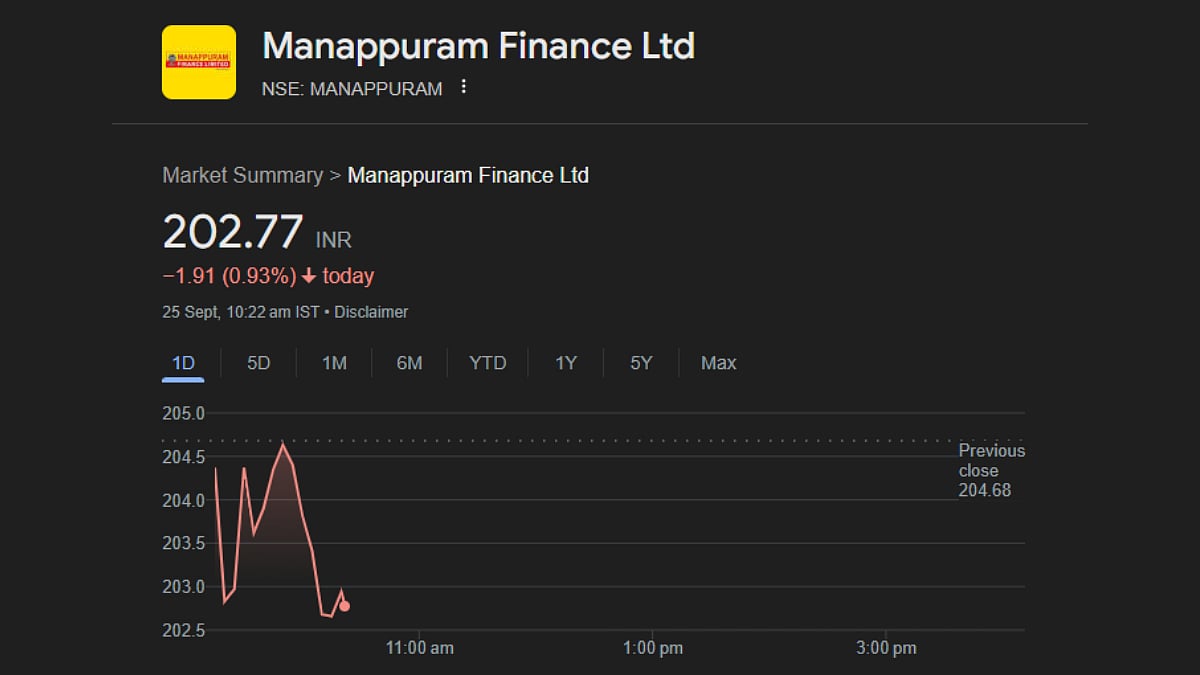 However, one of its biggest competitors, Manappuram Finance, was travelling in the opposite direction, with losses of close to 1 per cent. At the time of writing, the shares of Manappuram Finance dipped by 0.93 per cent or Rs 1.91. This took the overall dip to Rs 202.77 per share.