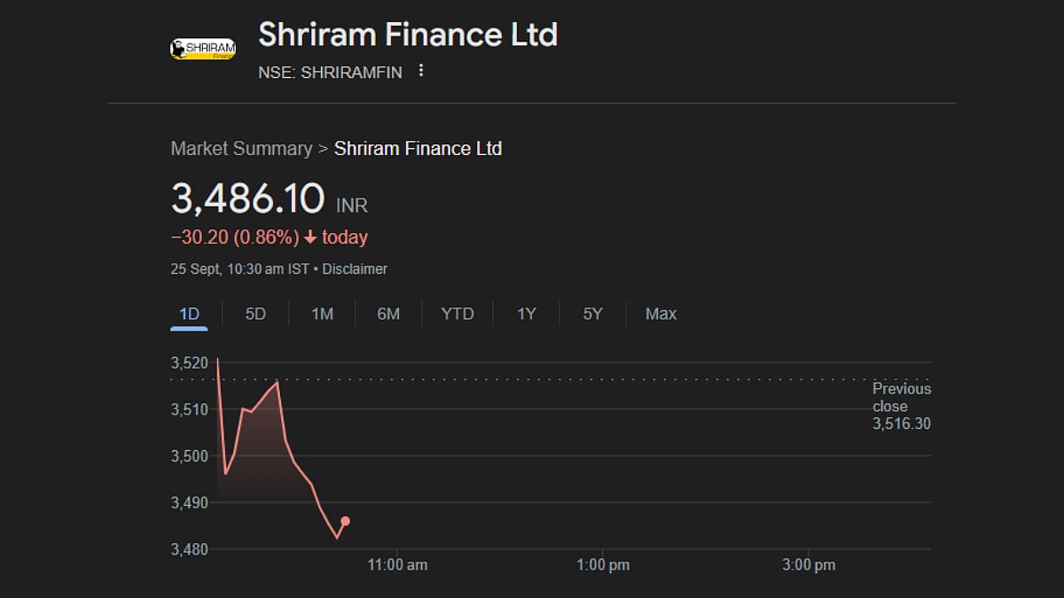 The Mumbai-based Shriram Finance was in the red at the time of writing. The company shares dipped by 0.86 per cent or Rs 30.20, taking the overall value of the shares to Rs 3,486.10 per share, bringing it down, below the Rs 3,500 mark.