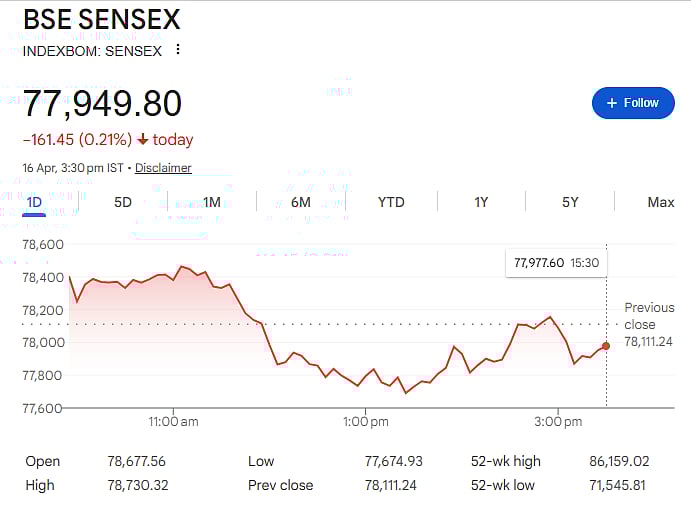 Sensex also followed a similar trend. It fell sharply during the day but recovered towards the end, closing at 77,949.80, down 161.45 points or 0.21 percent, after hitting a low of 77,674.93.