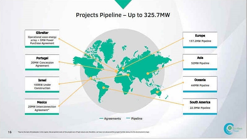EWP currently holds a significant project-pipeline of more than 325.7MW worldwide. The company’s pipeline projects are mostly located in markets which already have a significant interest in implementing wave energy technologies as part of their renewable energy mix. EWP is seeking to bring its innovative technology to additional countries which are suitable for wave energy production worldwide, such as the U.S., New Zealand, Canada, and South Africa all of which have large potential for the implementation of wave energy technologies.