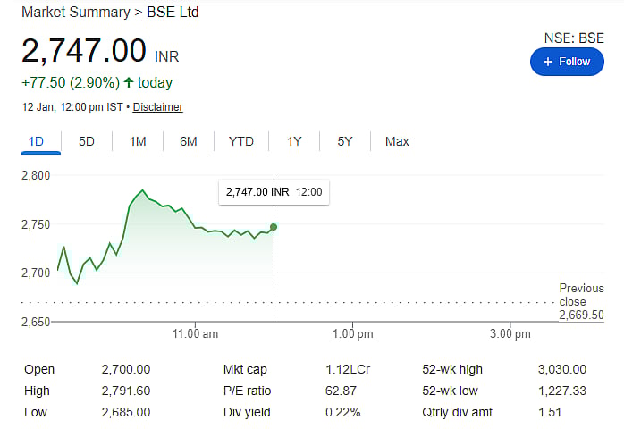 Mumbai: Shares of BSE Ltd rose sharply on Monday, January 12, gaining over 4.5 percent in morning trade. The stock touched a high of Rs 2,791.60 on the NSE as investors reacted positively to fresh news around the long-awaited IPO of the National Stock Exchange (NSE).
