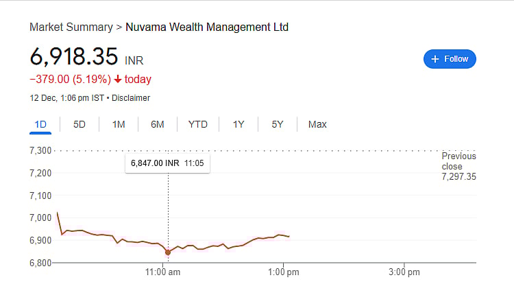 Nuvama Wealth Management share were currently trading at Rs 6,918.35 per share on the bourses, with a decline of 4.19 per cent on amounting to Rs 379.00 per share on the NSE (National Stock Exchange).
