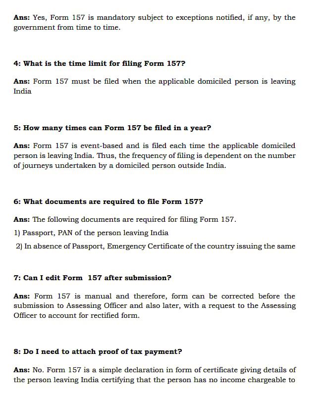 “Form 157 is event-based and is filed each time the applicable domiciled person is leaving India. Thus, the frequency of filing is dependent on the number of journeys undertaken by a domiciled person outside India,” it says.