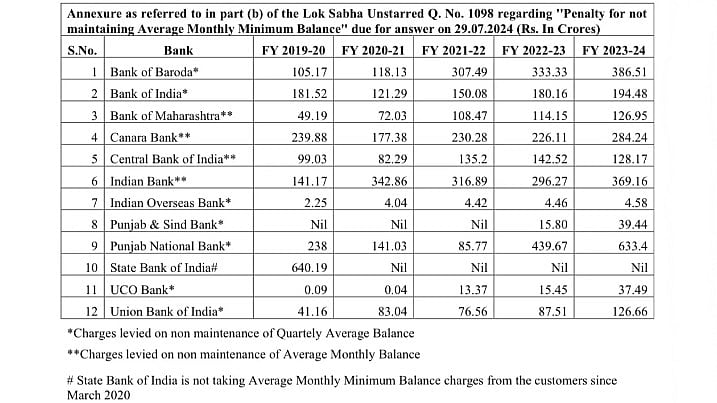 Notably, Indian Overseas Bank earned the least by charging customers for not maintaining the minimum balance in their accounts, which stood at Rs 4.58 crore in FY 2024.