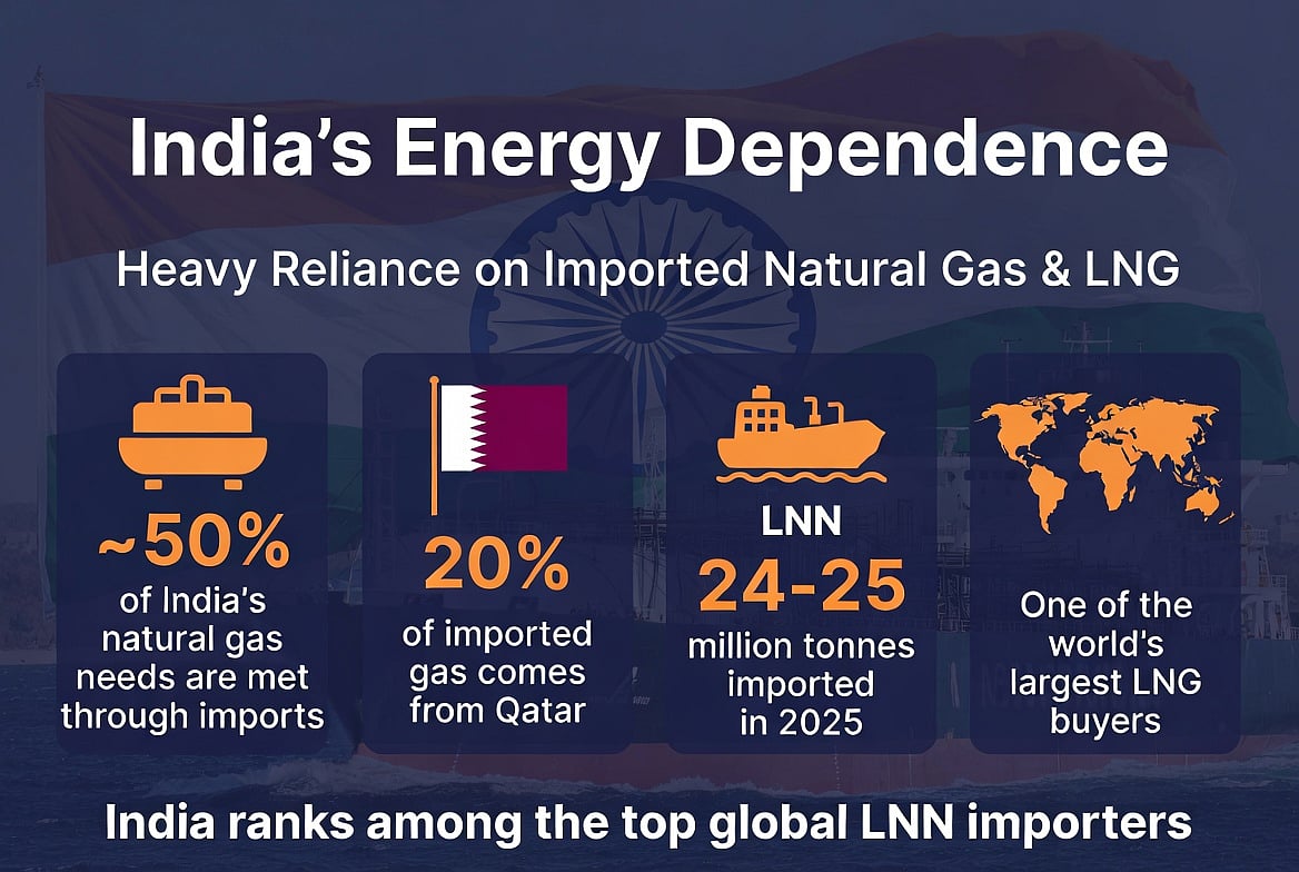 India is highly dependent on imported energy. Around 50 percent of its natural gas needs come from imports, and about 20 percent of this comes from Qatar. In 2025, India imported 24–25 million tonnes of LNG, making it one of the world’s largest buyers.