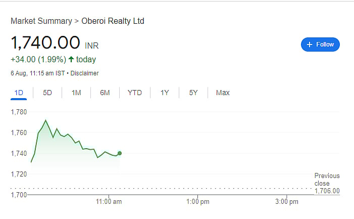 The residential real estate giant Oberoi Realty's shares also zoomed past 2.66 per cent on Dalal Street. The stock opened at Rs. 1,730.10 per share touching a day-high level of Rs. 1,775.00 per share today.