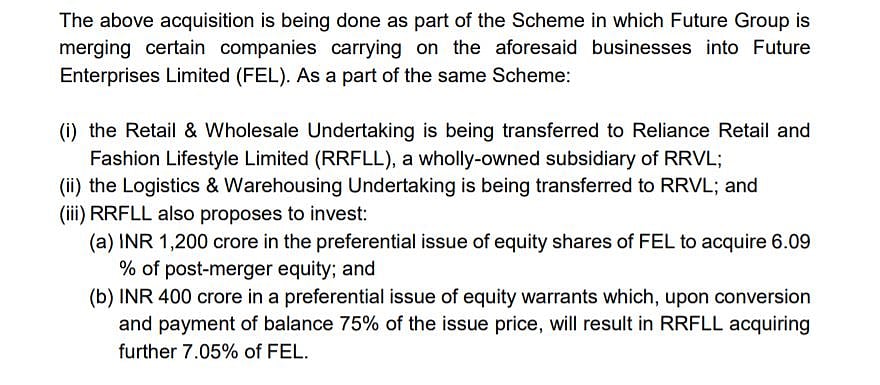 According to the BSE filing, "The above acquisition is being done as part of the Scheme in which Future Group is merging certain companies carrying on the aforesaid businesses into Future Enterprises Limited (FEL)".