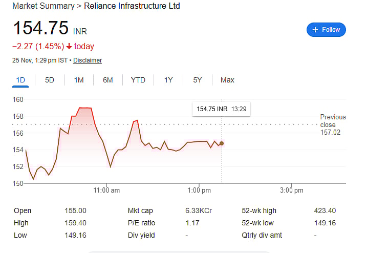 Reliance Infrastructure’s 52-week high stands at Rs 425, which it touched on June 27, 2025. But by November 25, 2025, the stock crashed to Rs 149.85, marking a fall of over 63 percent.