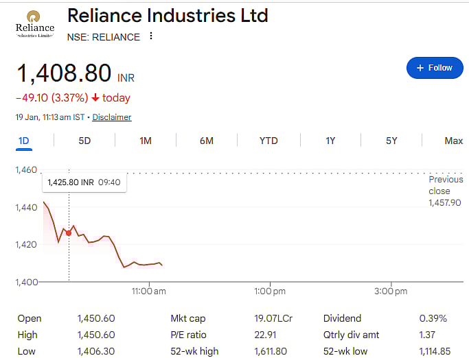 Mumbai: Shares of Reliance Industries, India’s most valuable company, fell sharply on Monday after the company announced its December quarter (Q3 FY26) results. The stock dropped as much as 3.37 percent to an intraday low of Rs 1,406 on the NSE. This marked its biggest single-day fall since January 2025. By mid-morning, the stock was still down over 3 percent, underperforming the broader market.