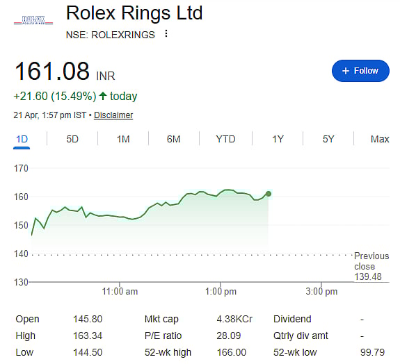 Rolex Rings Share Price: Shares of auto components maker Rolex Rings saw a sharp rally on April 21, rising 15.49 percent to Rs 161.08. The stock also touched an intraday high of Rs 163.34.