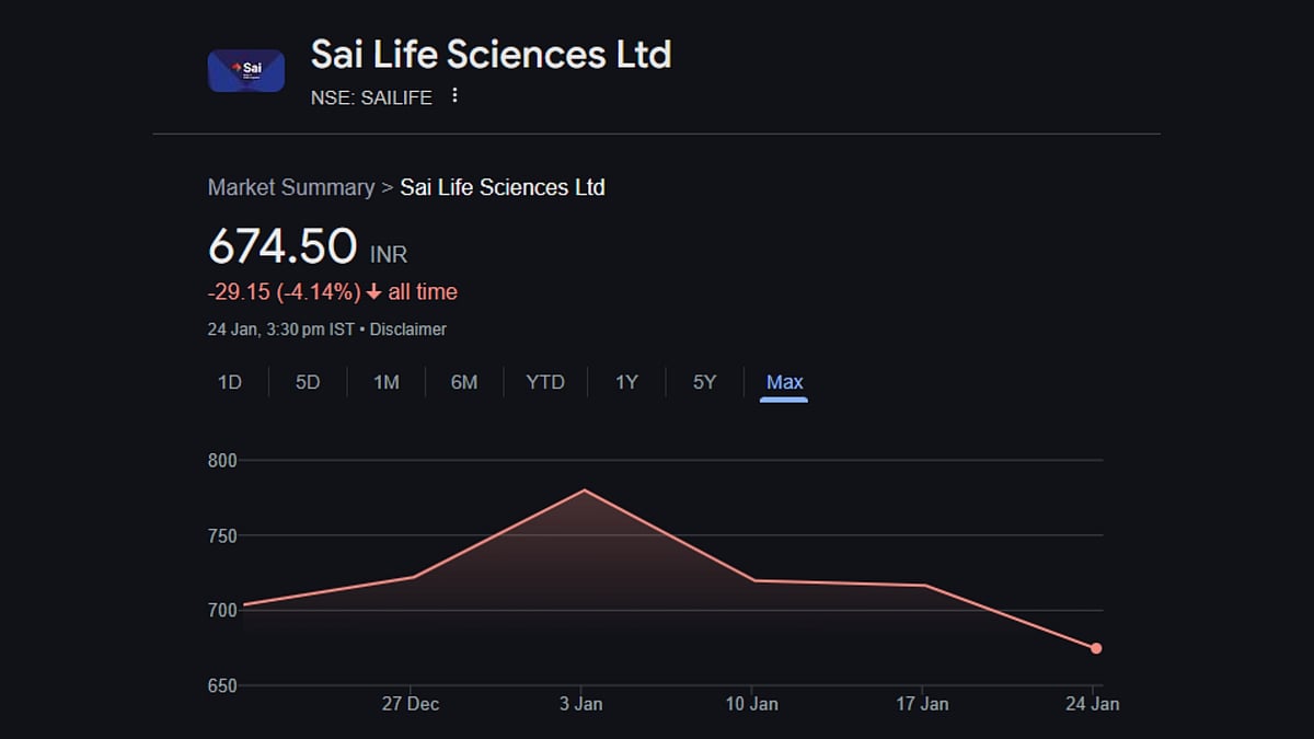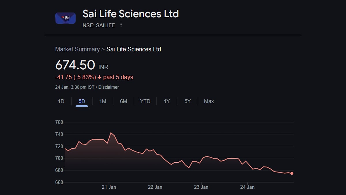 Furthermore, the ever since its listing at the exchanges, the shares of Sai Life Sciences have dropped in value by a cumulative of 4.14 per cent or 29.15, slumping to Rs 674.50.