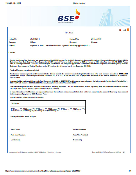 The Exchange clarified that SEBI turnover fees along with GST will continue to be debited separately with clear narration so Members can track the charges easily.