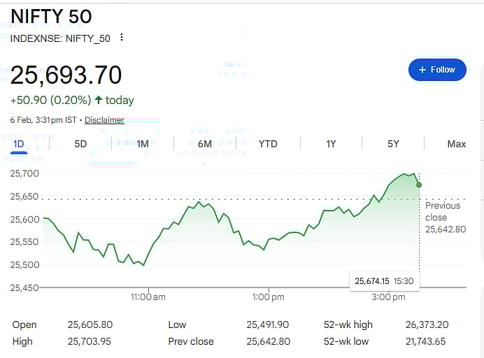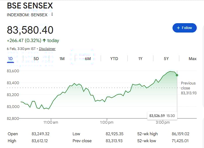 Mumbai: The Indian stock market closed slightly higher on February 6 after a volatile trading session. The BSE Sensex gained 266.47 points to end at 83,580.40, while the Nifty 50 rose 50.90 points to close at 25,693.70. The overall market mood remained cautious but stable.