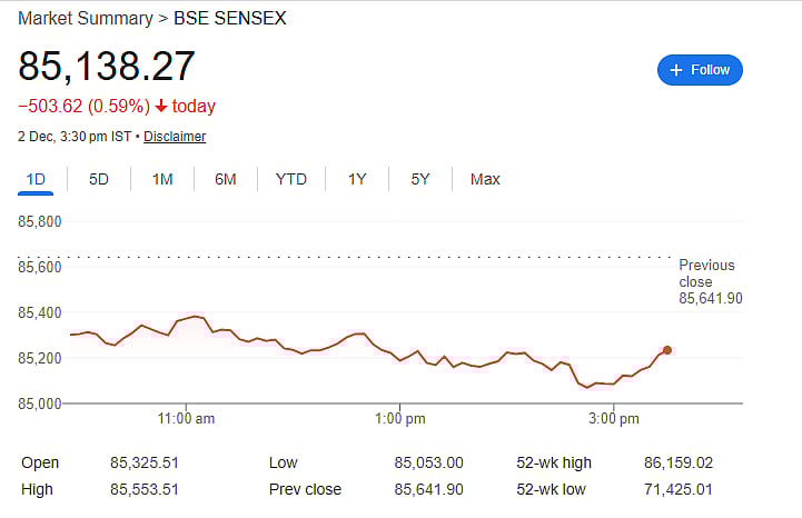 Mumbai: Indian stock markets continued their downward slide on Tuesday, with the Sensex dropping 503.63 points to close at 85,138.27. The index fell nearly 589 points intraday, extending its losing streak to three sessions. This came just a day after the benchmark touched a record high during morning trade before profit booking pulled it down.