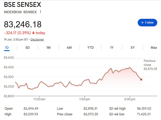 At the end of the session, the Sensex fell 324.17 points, or 0.39 per cent, to close at 83,246.18. The Nifty declined 108.85 points, or 0.42 per cent, settling at 25,585.5.