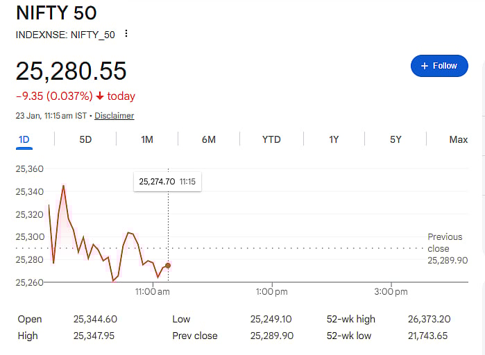 On Thursday, both benchmark indices had closed nearly 0.5 percent higher, ending a three-session losing streak. That recovery was supported by positive global cues after US President Donald Trump softened his stance on proposed tariffs against European countries and ruled out the use of force over Greenland.