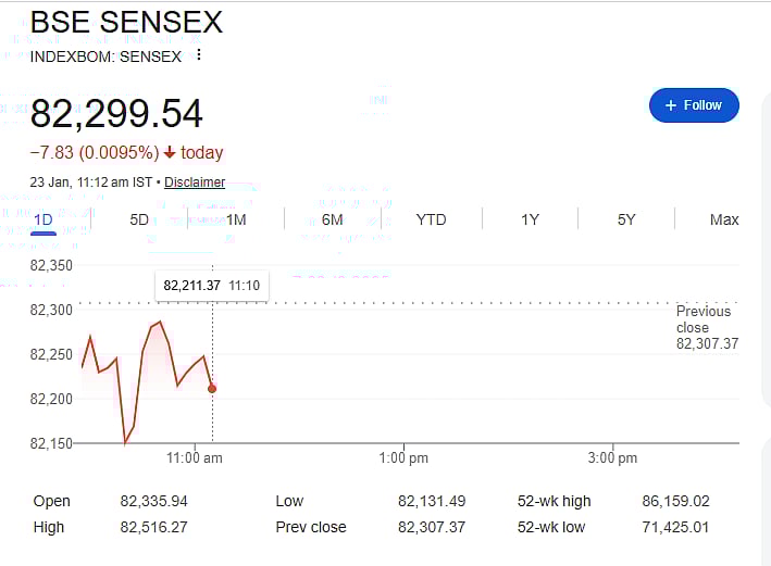 The Sensex opened at 82,335.94 and moved up to an intraday high of 82,516.27. However, profit booking at higher levels dragged the index lower. By 11.12 am, the Sensex was trading 7.83 points, or 0.0095 percent, down at 82,299.54.