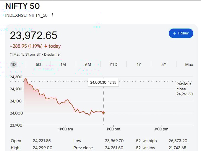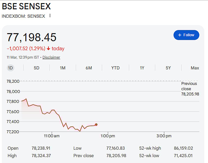 The BSE Sensex dropped 1,007 points or 1.29 percent to trade at 77,198. Meanwhile, the NSE Nifty fell 288 points or 1.19 percent to 23,972.