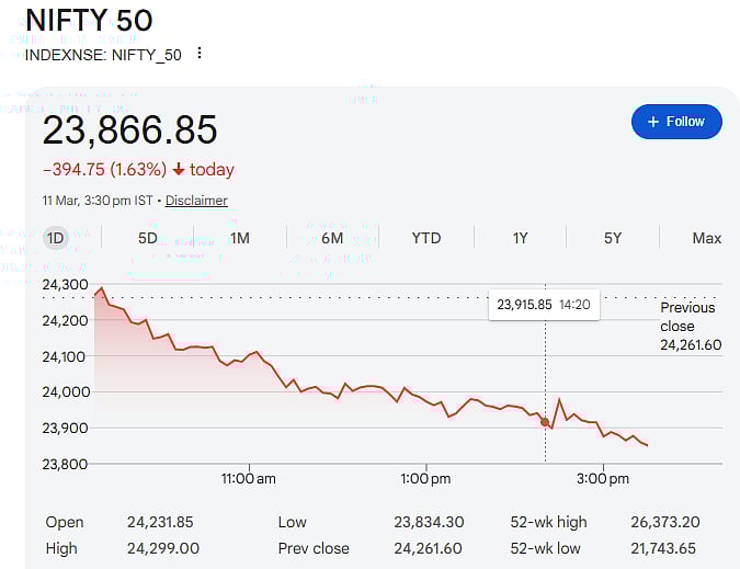 The Sensex dropped 1,342 points to close at 76,864, while the Nifty 50 declined 395 points to settle at 23,867. With this fall, the Nifty slipped below the important 23,900 level, showing the weakness in the broader market.