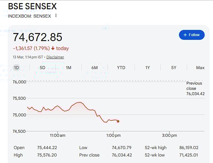 The 30-share BSE Sensex fell 1,361.57 points, or 1.79 percent, to 74,672.85 during the trading session. At the same time, the NSE Nifty dropped 461.15 points, or 1.95 percent, to 23,178.00.