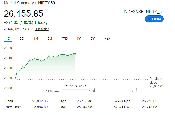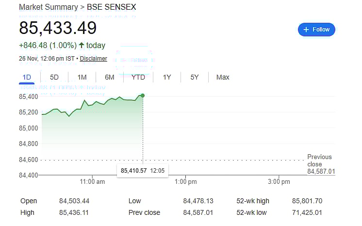 By 12.06 p.m., the Sensex rose 846 points to cross 85,400, while Nifty gained 271 points to cross 26,100. Market breadth was strong, with 1,534 stocks rising and 724 falling. All sectoral indices opened in the green, indicating widespread buying interest.