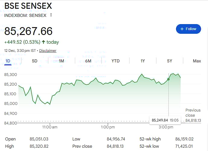 By the end of the trading session, the Sensex climbed 449.53 points (0.53 percent) to 85,267.66, while the Nifty gained 148.40 points (0.57 percent) to reach 26,046.95.