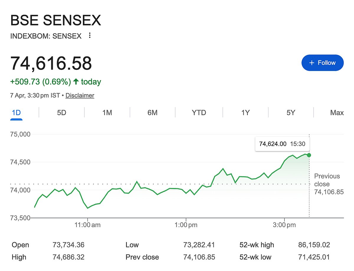 During the day, markets remained volatile. The Sensex moved in a wide range of over 1,400 points, hitting a high of 74,686.32 and a low of 73,282.41 before settling higher.