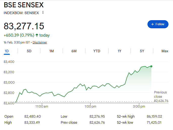The 30-share Sensex rose 650.39 points, or 0.79 percent, to close at 83,277.15. The broader Nifty gained 211.65 points, or 0.83 percent, ending at 25,682.75. The rally came mainly in the final hours of trading.