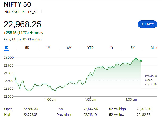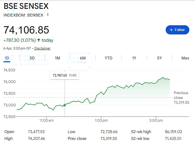 Mumbai: Indian stock markets closed higher on Monday, April 6, with both benchmark indices posting solid gains. The Sensex rose 787 points to 74,106.85, while the Nifty 50 gained 255 points to end at 22,968.25.