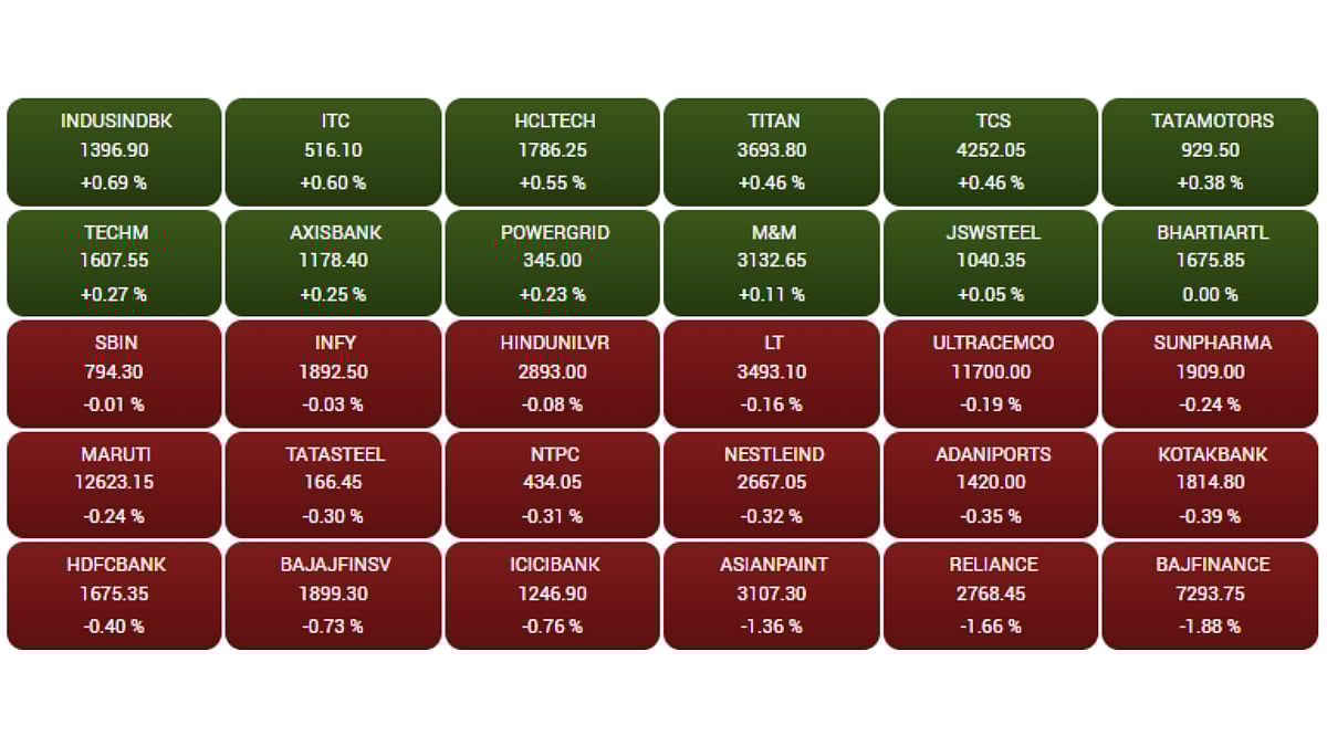 From the Sensex pack, IndusInd Bank, ITC and HCL Tech were among the major gainers in the morning session, whereas Bajaj Finserv, Reliance and Asian Paints were among the laggards.