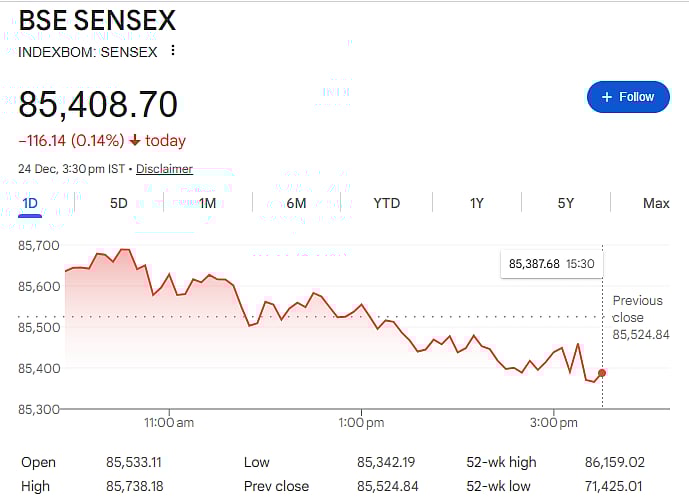 The Sensex ended the session at 85,408.70, down 116.14 points or 0.14 percent. The Nifty also slipped, closing at 26,142.10, losing 35.05 points or 0.13 percent compared to the previous session.