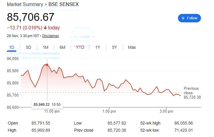 Sensex: Closed at 85,706.67, down 13.71 points (0.02 percent)