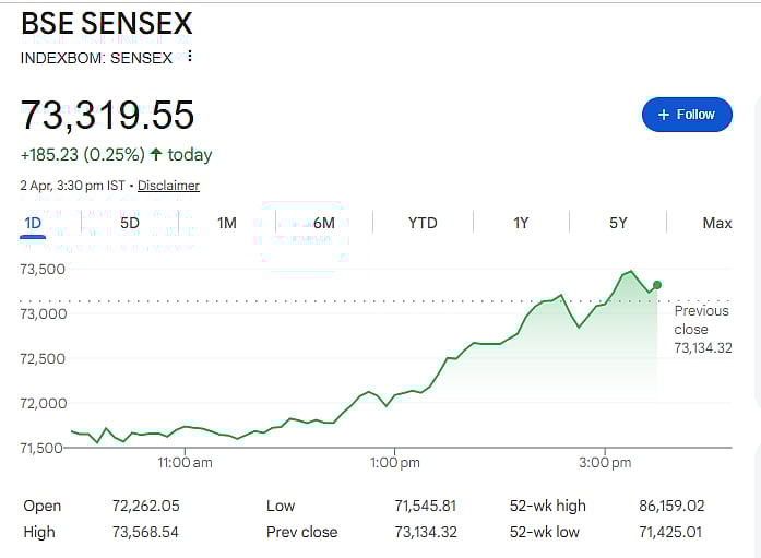 On Wednesday, Sensex had jumped 1,186.77 points to close at 73,134.32, while Nifty rose 348 points to end at 22,679.40.