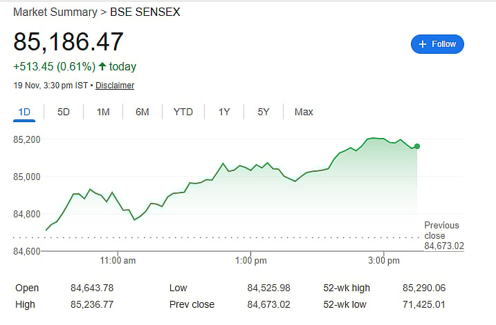 The Sensex ended at 85,186.47, gaining 513.45 points (0.61 percent). The index opened lower at 84,643.78 following the previous close of 84,673.02. However, value buying across key sectors propelled the index upward, allowing it to rebound more than 700 points from its intraday lows and hit a high of 85,236.77. The Nifty 50 also rose 142.60 points (0.55 percent) to close at 26,052.65, reclaiming the psychologically crucial 26,000 mark.