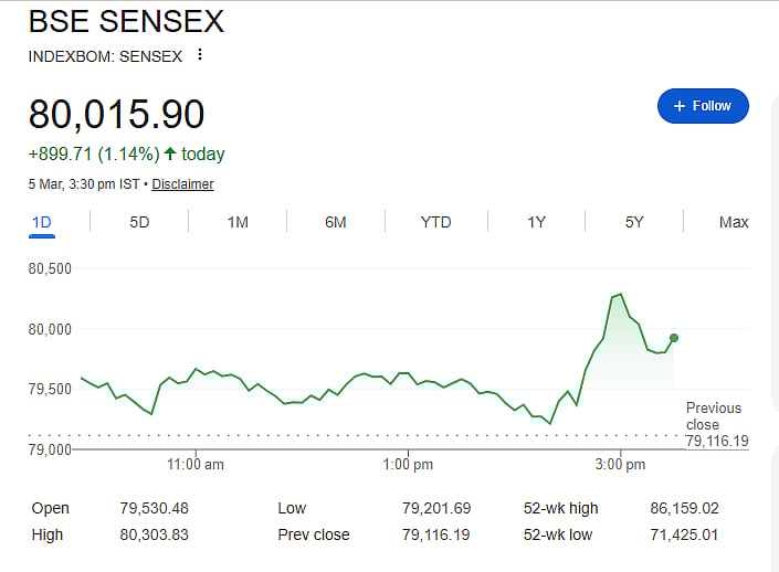 Mumbai: Indian stock markets witnessed a strong rally on Thursday, with benchmark indices closing sharply higher. The Sensex jumped 900 points, or 1.14 percent, to close at 80,015.90, while the Nifty 50 rose 285 points to end at 24,765.90.